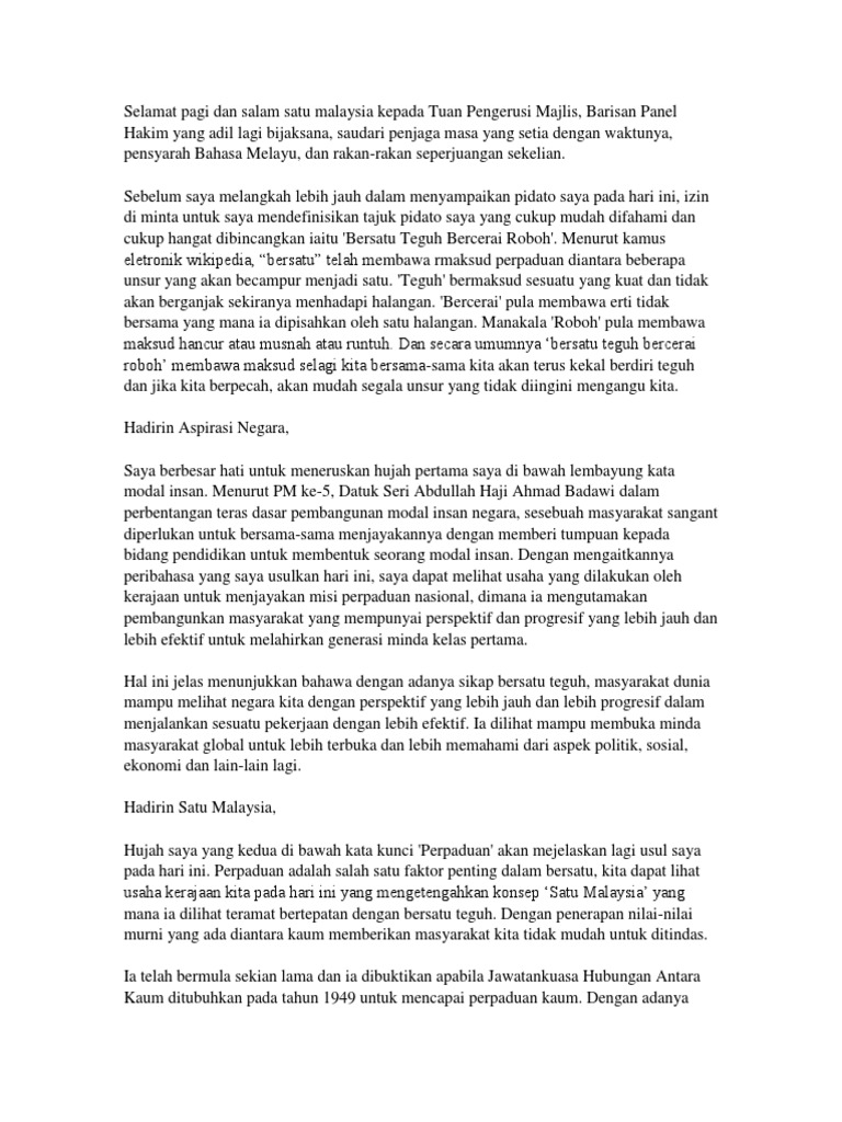 Sedangkan perkataan Bersatu diletakkan di hadapan berbanding perkataan Bercerai diletakkan di belakang menunjukkan betapa masyarakat melayu mendahulukan kesatuan dalam apa jua perkara. Assalamualaikum dan salam satu malaysia kepada Tuan Pengerusi Majlis Barisan Panel Hakim yang adil lagi bijaksana saudari penjaga masa yang setia dengan waktunya pensyarah Bahasa Melayu dan rakan-rakan seperjuangan sekelian. Masyarakat Indonesia tidak lagi asing dalam mendengar semboyan bersatu kita teguh bercerai kita runtuh.
